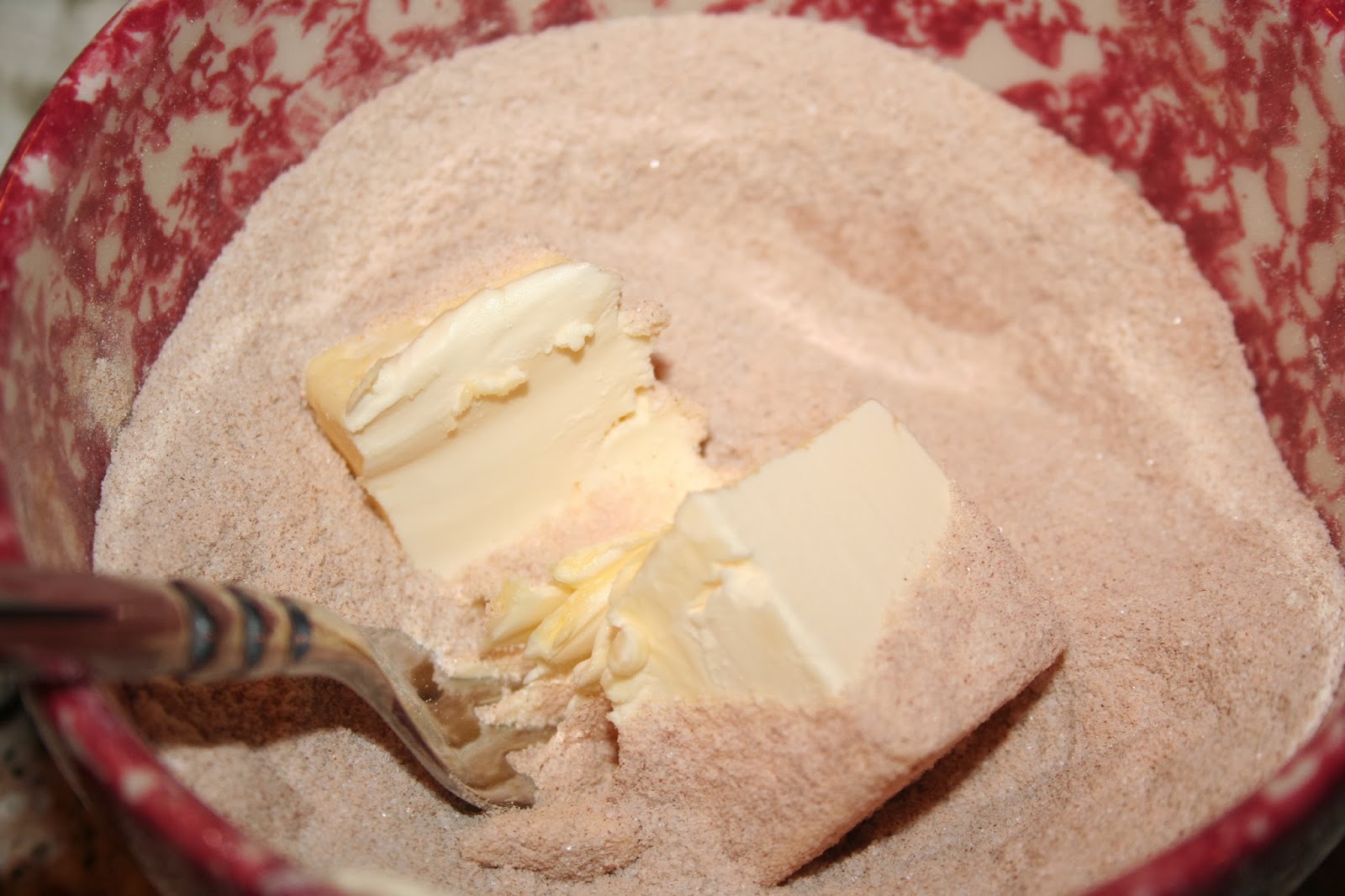 sugar, cinnamon. Add in butter. Use fork,