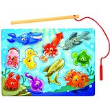 At home, we did it on a smaller scale with this fishing puzzle we had from Melissa and Doug. It was easier to use the puzzle but we also pulled the pieces out and put them on a blue sheet to represent the water. My son used the couch pillow to sit on an "island" outside the water to fish for them.